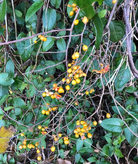 海に降りる手前の土手に、梅擬(うめもどき)が垂れ下がっている。一時は、野山で採りに出かけたが、今では、車をやめたせいもあるが、採らずにそのままにして、鑑賞したい。