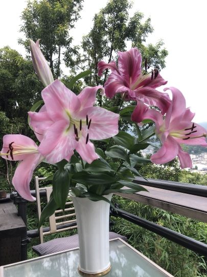 昨夜来の風雨で、今を盛りに咲いているカサブランカが何本も折れ下がっている。もったいないので、切り花にし、花瓶に生ける。咲いてよし、生けて良しの豪華さだ。