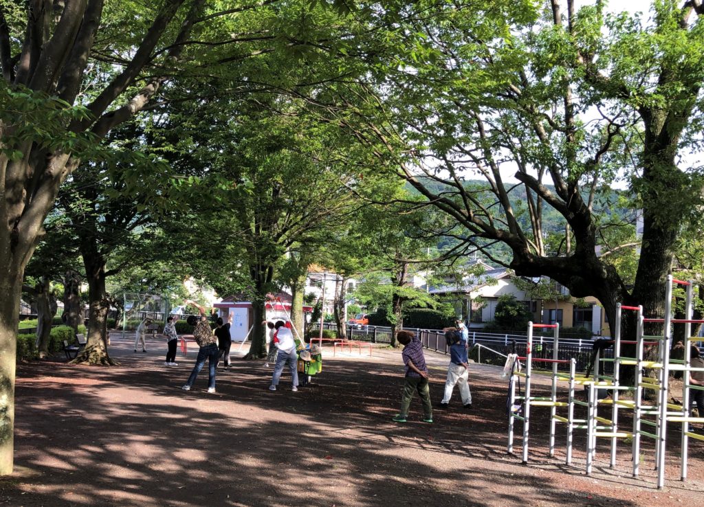 梅雨晴間、朝の中国健康体操会場の郷戸公園。蝉の声が大きくてラジカセの音がかき消される。