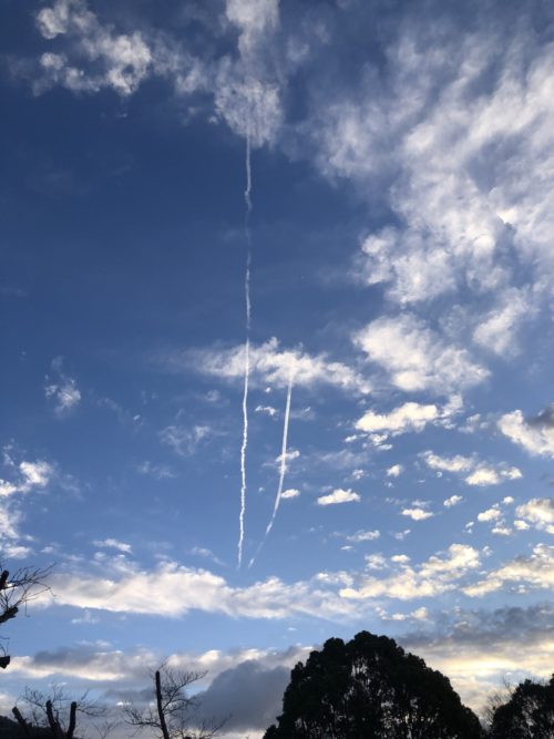 郷戸公園での朝体操。この季節、飛行機雲がよく見られる。空高く昇り、やがて富士山を目指して弧を描いて消える。