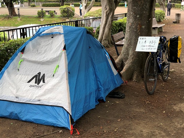2021年06月12日photo俳句勝爺日本一周梅雨梅雨の中日本一周一休み1752朝体操会場の郷戸公園に一張のテントあり。傍らに置かれた自転車に「日本一周中」のプレートが立てかけられている。トイレあり、水飲み場ありの公園は格好の宿泊場所ではある。コロナかなど無縁に違いない。 Tweet