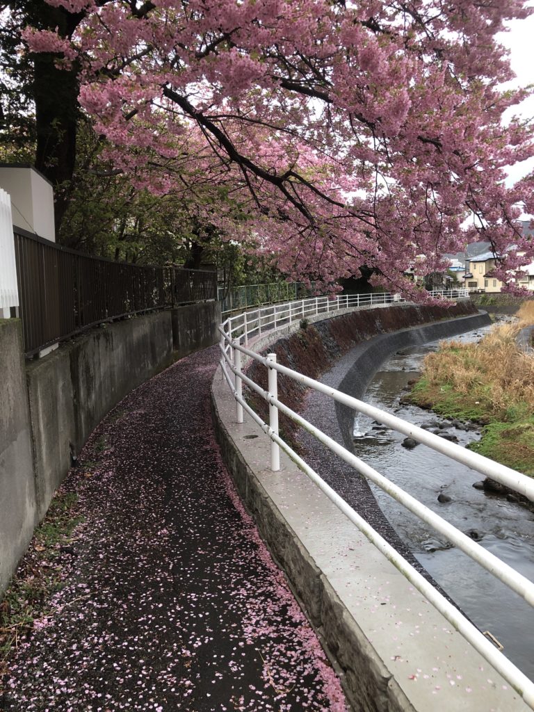 烏川に枝を落とす河津桜。目白やヒヨドリが群れ集う。散り降る花びらが小道を染める。(伊東市宇佐美)