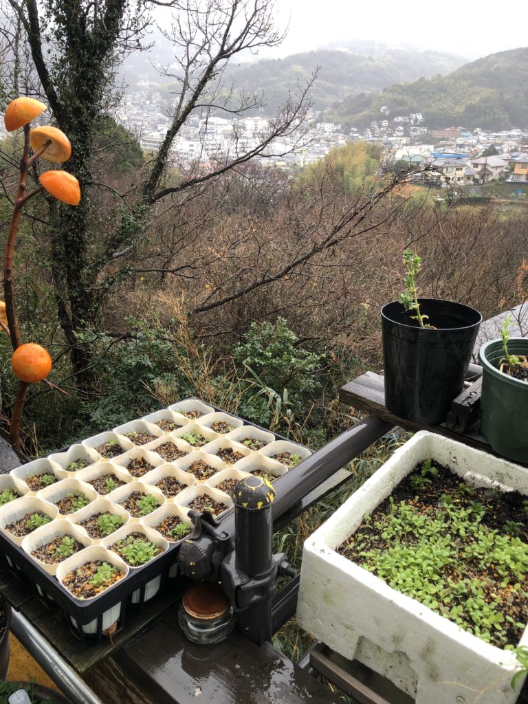 1週間前に種まきした数種類のレタスが3日続きの春雨で芽吹き始めた。(ベランダにて)
